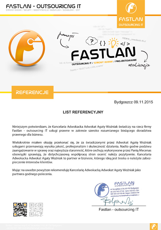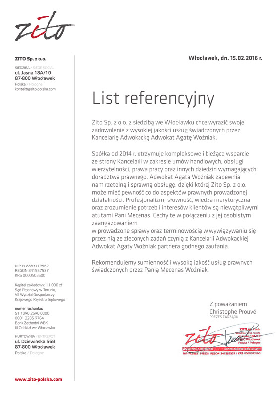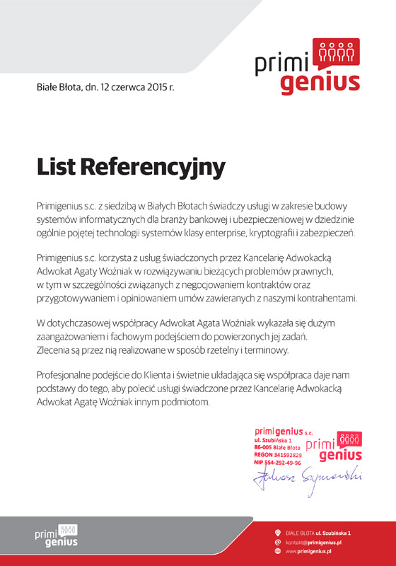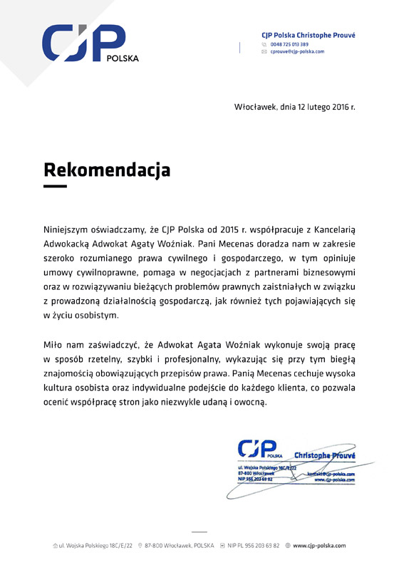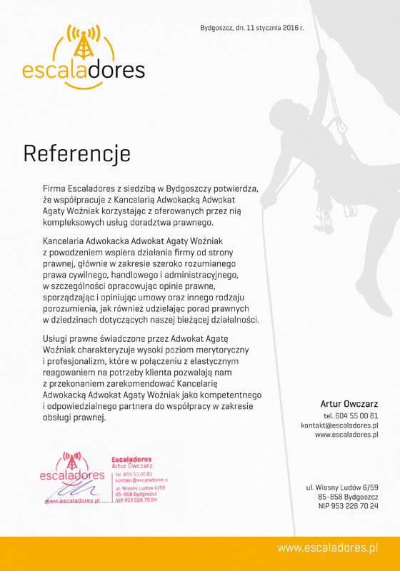 Tylko gdy ten warunek jest spełniony, zadowoleni Klienci mogą polecać nas innym. Aby mogli być Państwo pewni, że Kancelaria Adwokacka Adwokat Agaty Woźniak jest najlepszym wyborem, przedstawiamy referencje Klientów, którzy nam do tej pory zaufali.